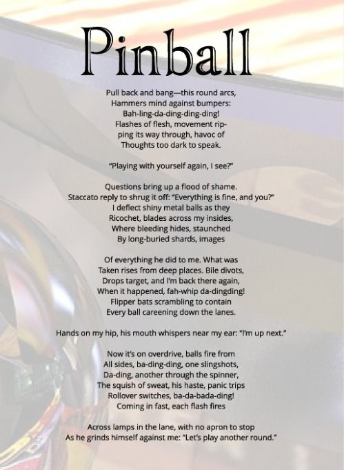 The purpose of this poem was to allow the reader, especially one who doesn't understand what trauma is like day in and day out, to step into it and really be present to it. The pinball metaphor definitely aided in evoking the tone and the theme and those revulsive and sickening moments. It's also built off of the characters in my book so I have a very clear picture in my head of their voice and the way that they interact. And I can't wait for it to come out in the anthology THINGS WE HAVEN'T SAID.